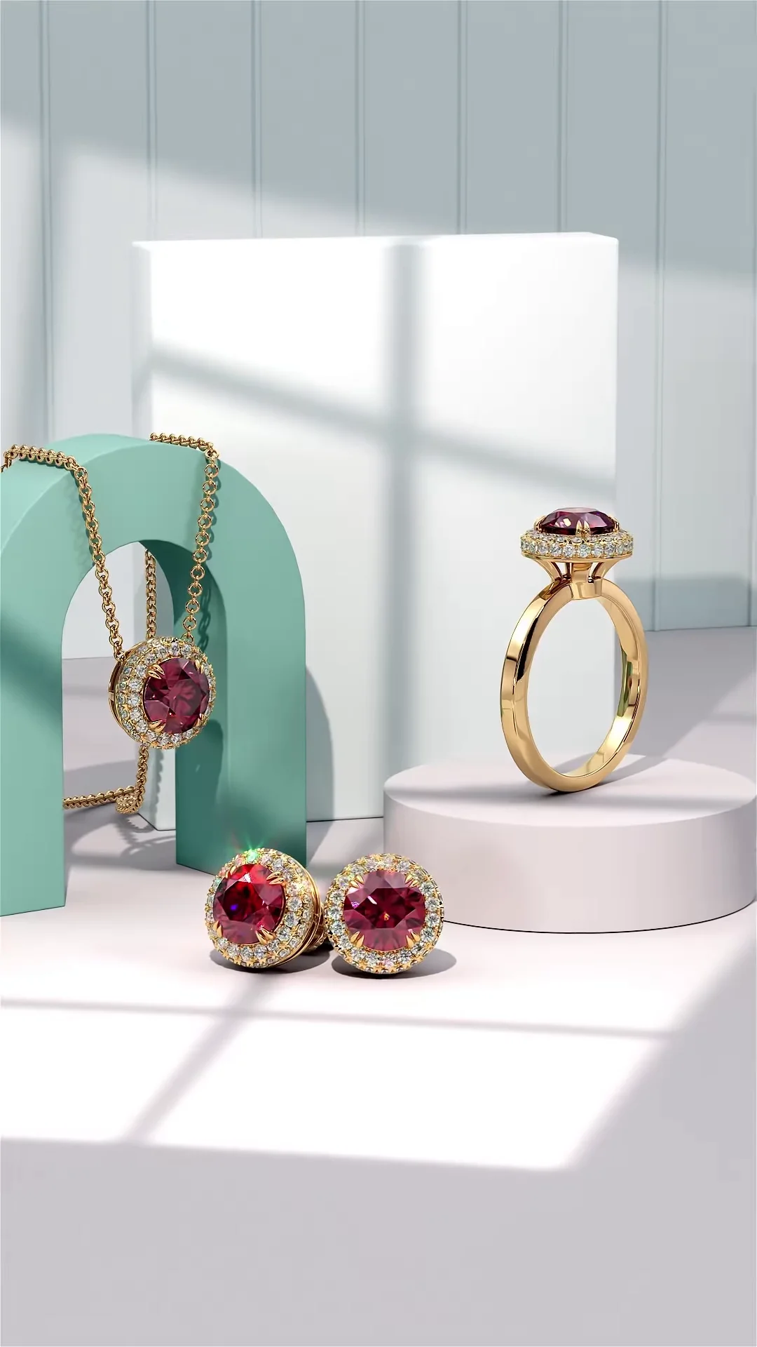 Earrings: The earrings are designed as stud or drop earrings, each featuring a central ruby surrounded by a halo of diamonds, similar to the necklace pendant and ring. Their size is perfectly balanced to be noticeable yet elegant, adding a touch of color and sparkle to the ears. The settings are in a matching gold tone.